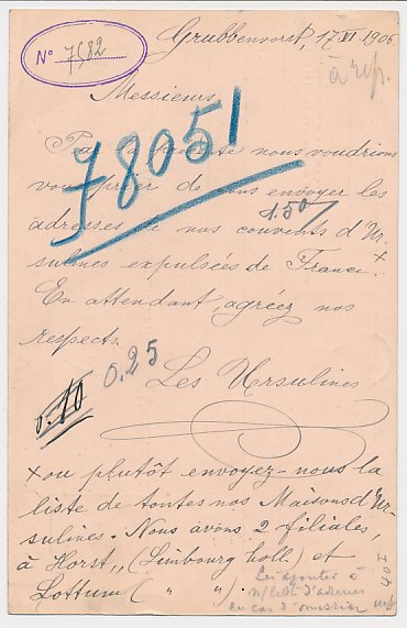 Grootrondstempel Grubbenvorst - Tournai Belgie 1906
