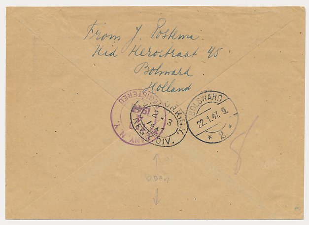 Aangetekend Bolsward 1947 - Overstempeld strookje Witmarsum