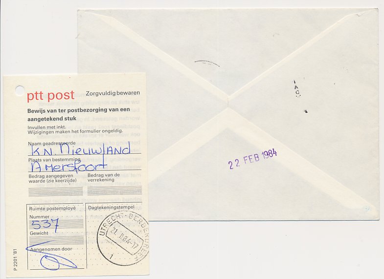 Aangetekend Utrecht Berberdreef 1984 - Overstempeld strookje