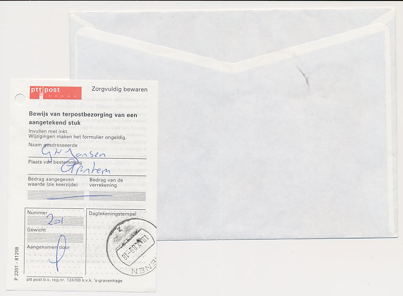 Aangetekend Rhenen 1988 - Overstempeld strookje Rheden