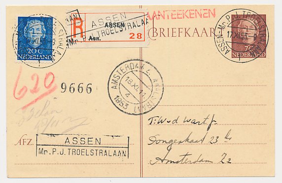 Aangetekend Assen Troelstralaan 1953 - Overstempeld strookje
