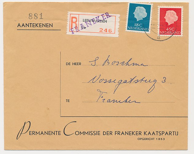 Aangetekend Franeker 196? - Overstempeld strookje Leeuwarden