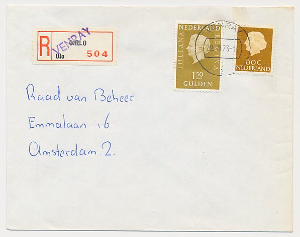 Aangetekend Venray 1973 - Overstempeld strookje Oirlo