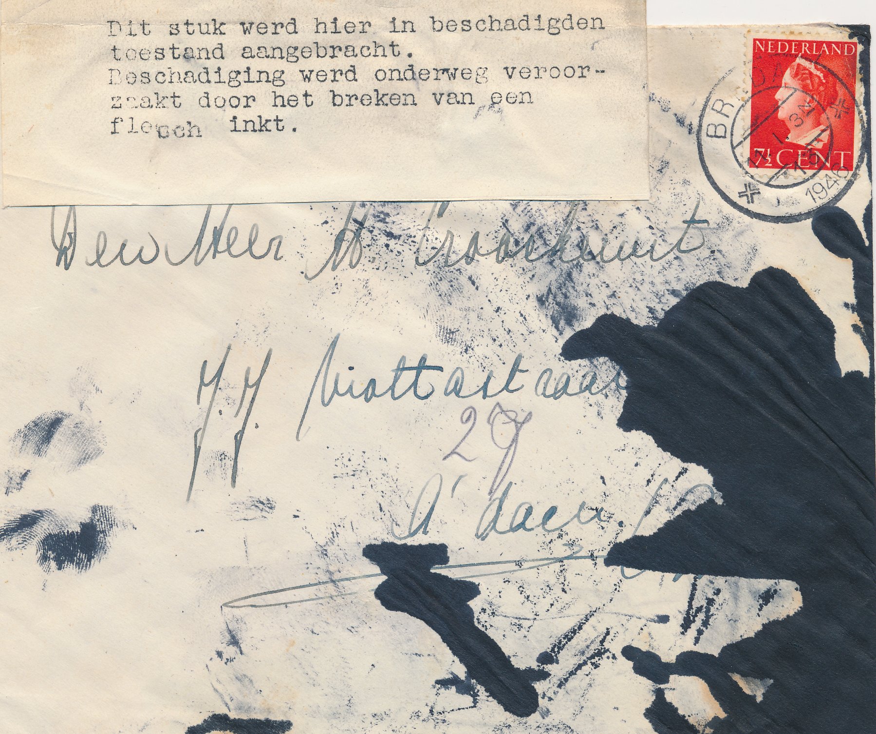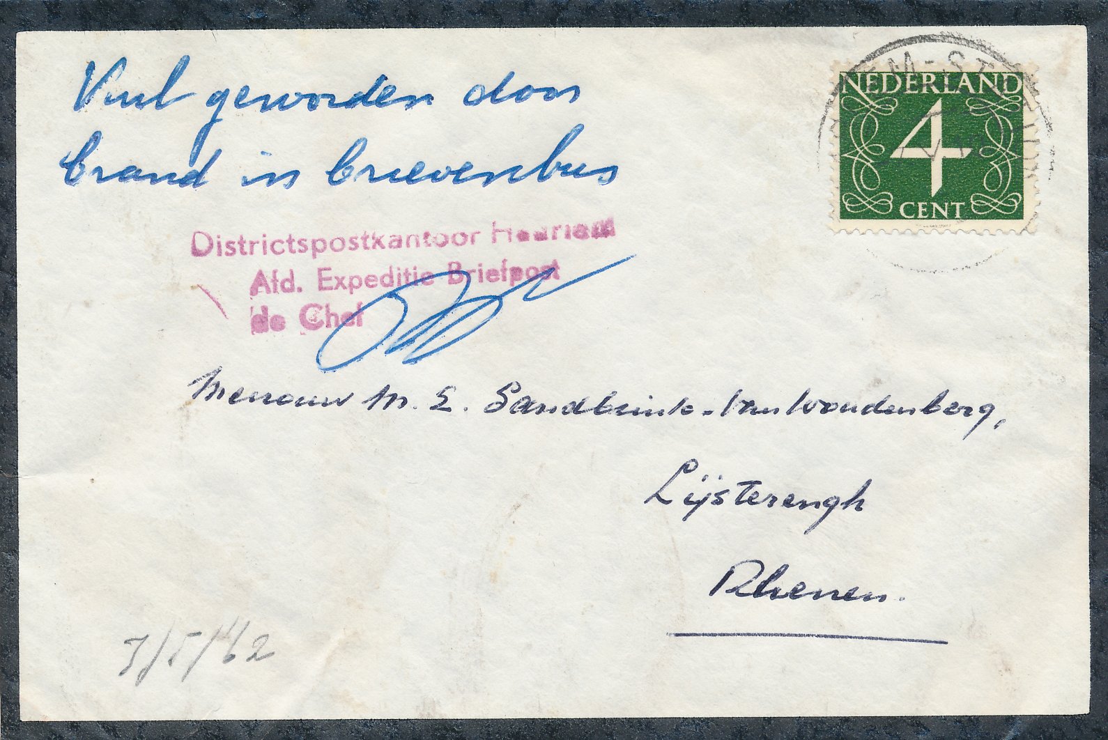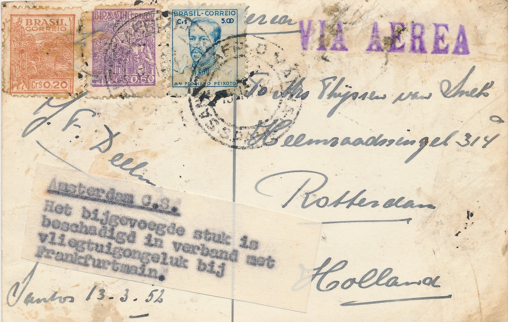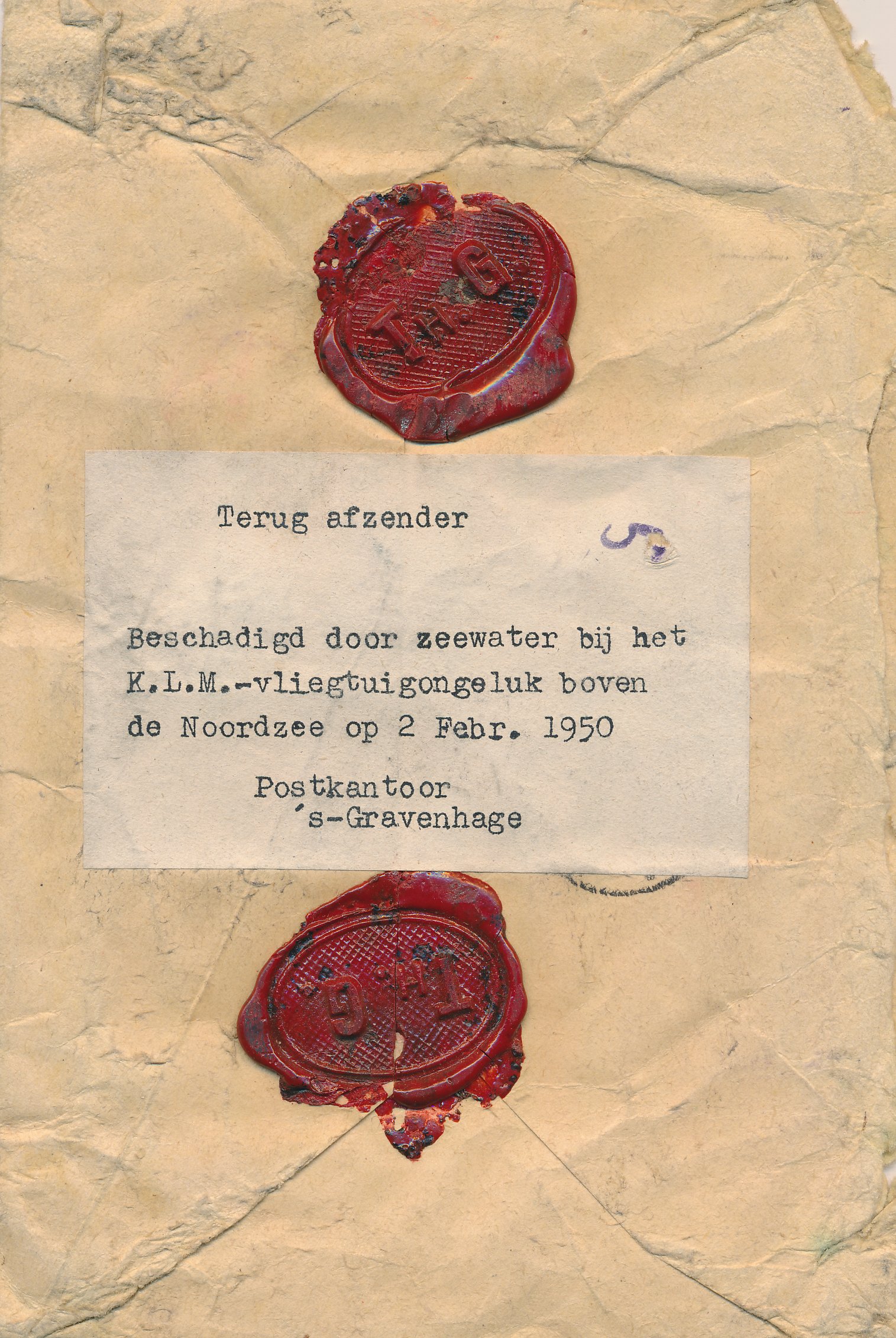 Ramppost / beschadigde post / besmeurde post / vertraagde post / crash mail / wreck mail / disaster mail (enveloppen, briefkaarten, enz.) die betrokken zijn geweest bij een ongeval, brand, kaping, enz. en die daarom voorzien zijn van kenmerken van de Nederlandse PTT / Posterijen, bijvoorbeeld met een stempel, etiket of begeleidende brief.