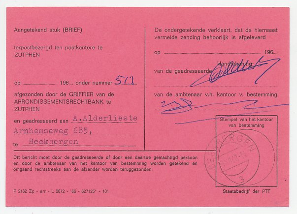 Dienst PTT Beekbergen - Zutphen 1968 Bericht van Ontvangst