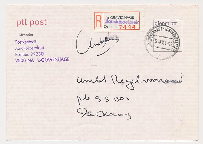 Aangetekend s Gravenhage Jonckbloetplein 1984 - Overstempeld strookje