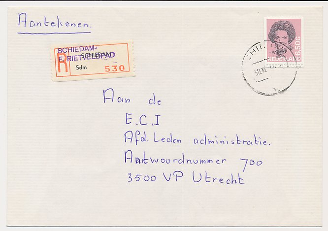 Aangetekend Schiedam Rietveldpad 19?? - Overstempeld strookje