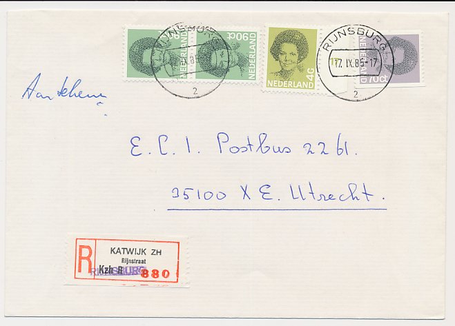 Aangetekend Rijnsburg 1985 - Overstempeld strookje Katwijk