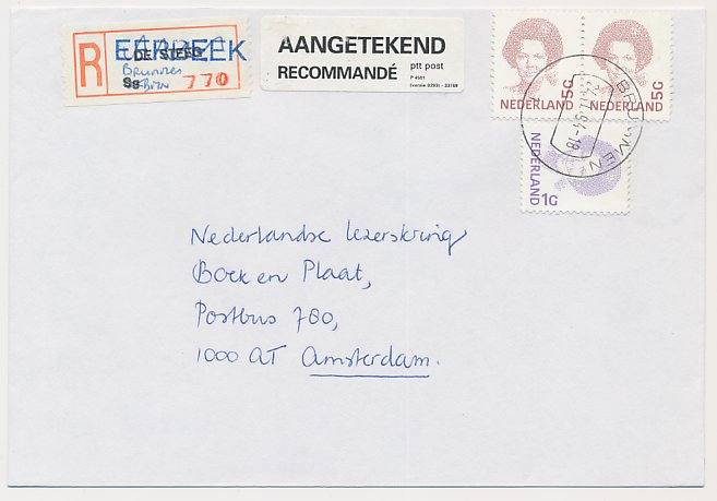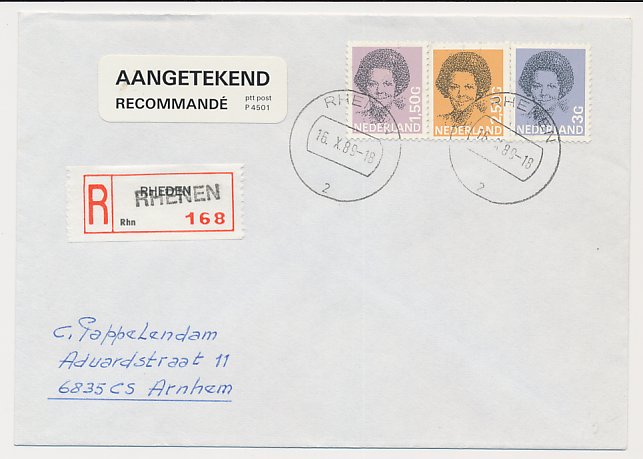 Aangetekend Rhenen 1989 - Overstempeld strookje Rheden