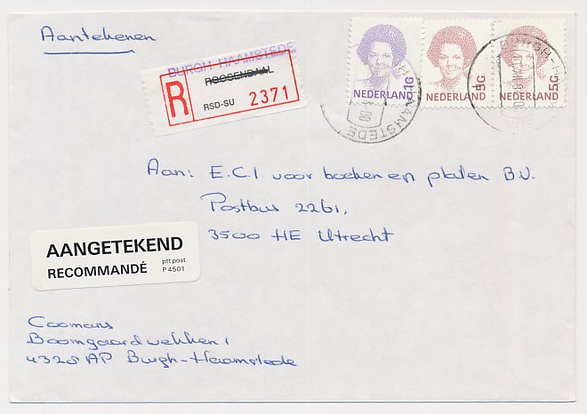 Aangetekend Burgh Haamstede 1994 - Overstempeld strookje Roosendaal