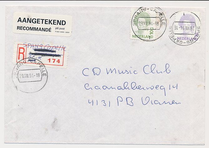 Aangetekend Sprang-Capelle 1994 - Overstempeld strookje Oisterwijk